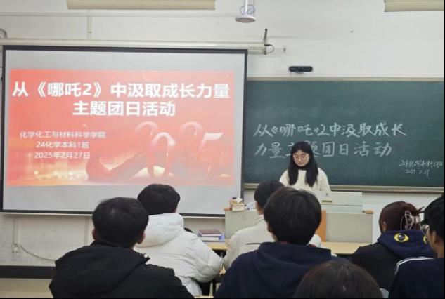 活动中,各团支部紧扣“成长与突破”主题,设计多个环节。首先回顾电影《哪吒之魔童闹海》(以下简称《哪吒2》)中的动人情节。其次,同学们围绕当代青年面临哪些‘命运’与‘成见’的挑战、思考Deep Seek在各领域的应用等议题热烈讨论。现场气氛活跃,同学们结合自身学习生活实际,分享了对“责任担当”“亲情友谊”及“自我认同”的深刻理解,形成了“思成长、辨方向、强决心”的良好氛围。