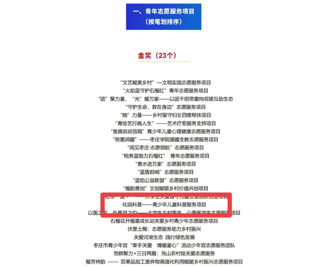 近日,第六届枣庄市青年志愿服务项目大赛圆满落幕,beat365”化说科普——青少年儿童科普服务项目“凭借出色的志愿服务成效与专业特色,在大赛中斩获金奖。